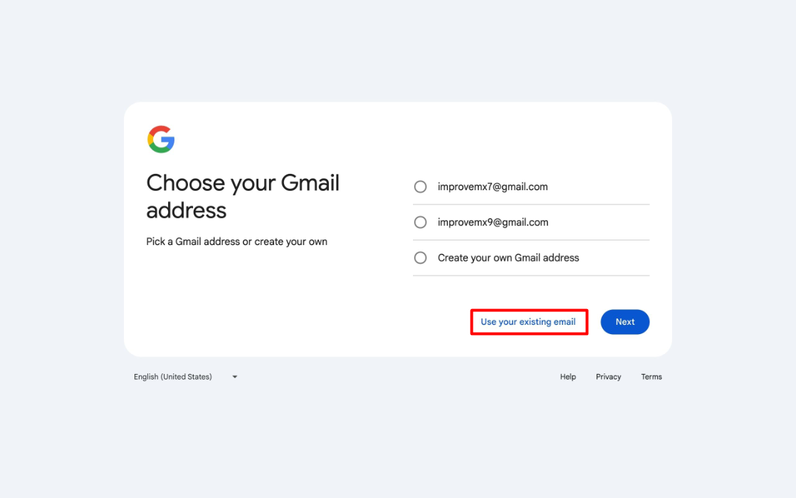 Instead of letting Google pick a random Gmail address alias for you, click Use your existing email at the bottom.