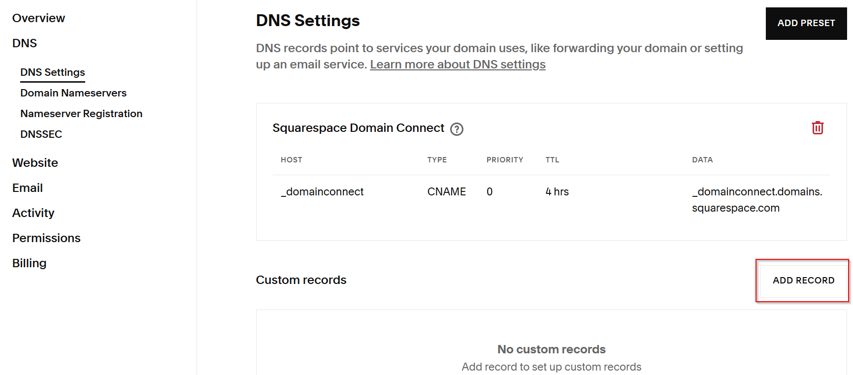 In Squarespace, click "Add Record".