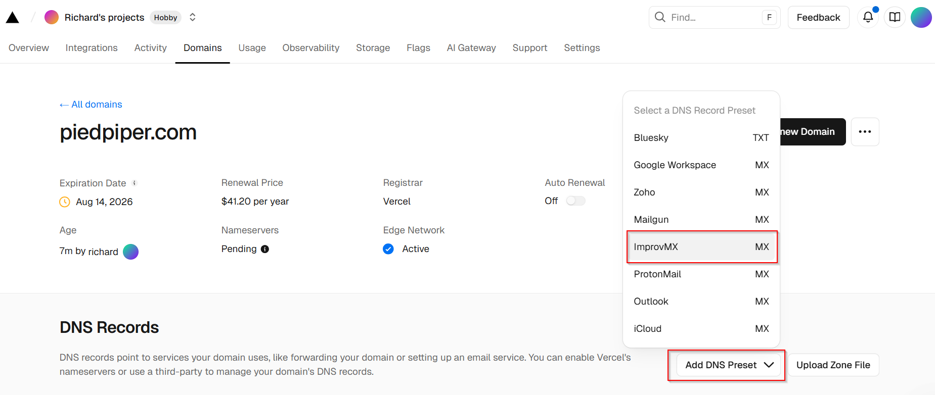 Quickly and easily set up your domain's DNS records in Vercel for ImprovMX email forwarding.