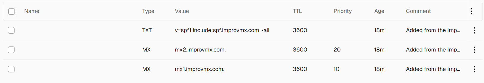 MX and SPF records are now added. Remove any non-ImprovMX MX records. Your DNS configuration should match the example below.
